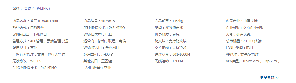 參數(shù) [品牌] tp-link [型號] TL-WAR1200L [產(chǎn)地] 中國 [單位] 臺