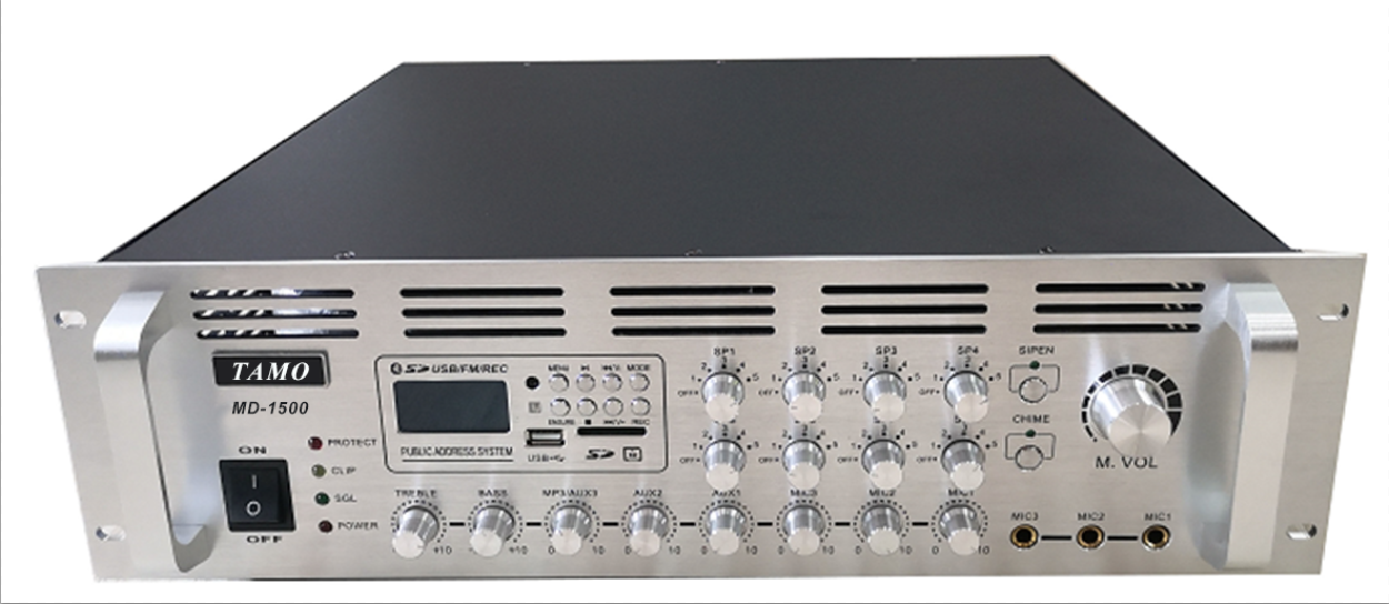 ◆功能特性:帶藍(lán)牙8分區(qū)系列功放均為合并式帶U盤播放,U盤錄音,FM收音,藍(lán)牙接收,普通8分區(qū)和8分區(qū)獨(dú)立音量控制功能于一體的廣播擴(kuò)聲機(jī),具有3路話筒輸入,MIC1為優(yōu)先話筒帶默音優(yōu)先功能,3路線路輔助輸入,可接CD/卡座及調(diào)諧器等。話筒及線路音量均獨(dú)立可調(diào)。本機(jī)具有統(tǒng)一的音調(diào)控制,使輸出音色亦能方便調(diào)節(jié).還設(shè)有線路輸出,可用錄音或鏈接其它功放使用。
